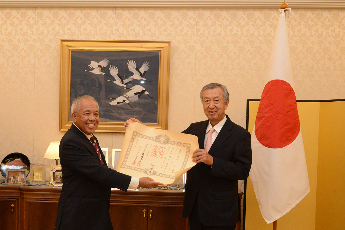 Chairman of SIRIM, Academician Tan Sri Dr. Ahmad Tajuddin Ali, receiving The Order of the Rising Sun, Gold Rays with Neck Ribbon from the Government of Japan. The award was presented by Japanese Ambassador to Malaysia, Dr Makio Miyagawa at Japanese Embassy in Kuala Lumpur, Thursday.